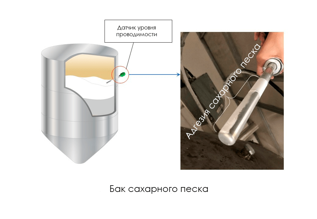 Датчик уровня проводимости отлично подходит  для сахарного песка с высокой адгезией, который работает даже если на датчик налипает материал.