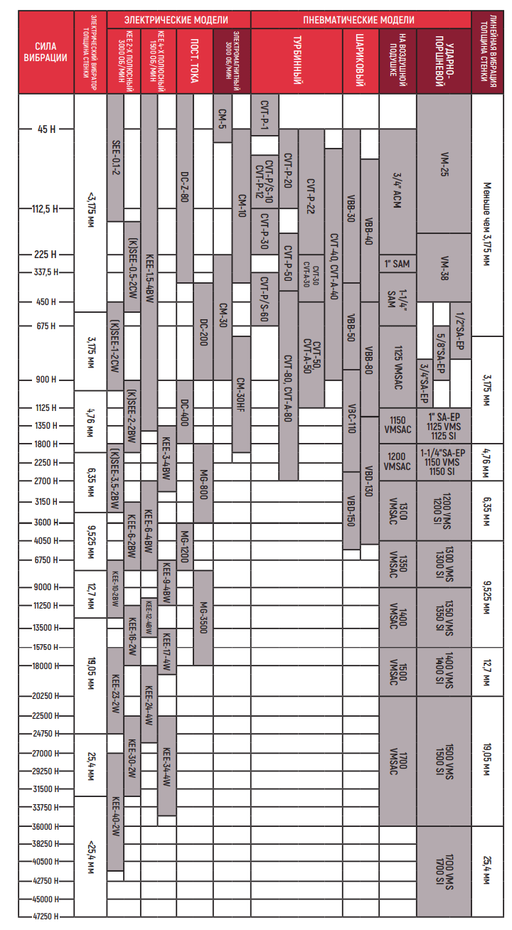 Используя предоставленную таблицу на этой странице, нарисуПеречислите их ниже и продолжайте:йте линию, начинающуюся с требуемой силы, рассчитанной на шаге 2, слева направо. Вы найдете на выбор несколько вибраторов, как электрических, так и пневматических моделей. Если вам нужно только вспомогательное средство для очистки, выберите размер вибратора в соответствии с таблицей толщины стенок.