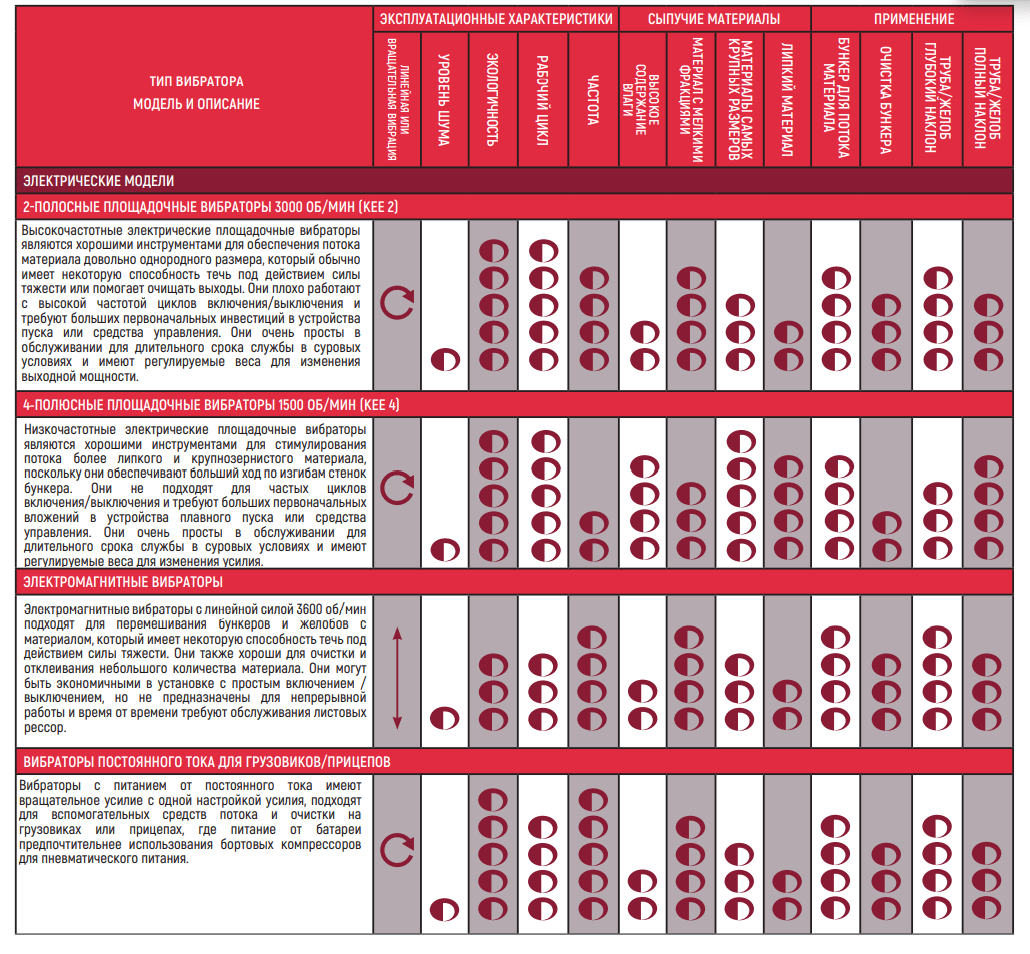 Теперь, когда вы нашли количество вибраторов и силу, необходимую для вашего приложения, вы обнаружите, что существует несколько вариантов вибраторов, которые лучше всего соответствуют вашим потребностям. На этом последнем шаге вы сделаете наилучший выбор, исходя из требований к источнику питания, шума и экологических проблем, свойств материала и области применения. На страницах 5 и 6 каждая модель вибратора описывается очень подробно, ранжируются сильные стороны множества различных моделей и типов вибраторов, предлагаемых Довой Технос Рус, чтобы помочь вам принять наилучшее решение, которое поможет выполнить работу.