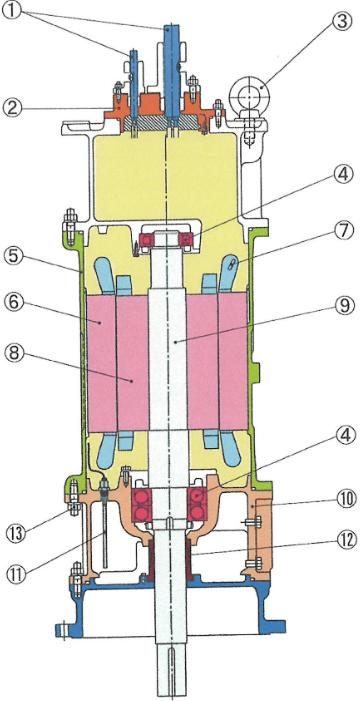 6 — ДВИГАТЕЛЬ. Трехфазный асинхронный двигатель с короткозамкнутым ротором, заполненный воздухом, для работы в погружных или сухих условиях. Обмотки статора изолированы негигроскопической системой изоляции класса F (155 ° C, 310 ° F) или класса H (180 ° C, 356 ° F). Прямое подключение до 10 л.с. и звезда-треугольник от 15 л.с. и выше являются стандартными.