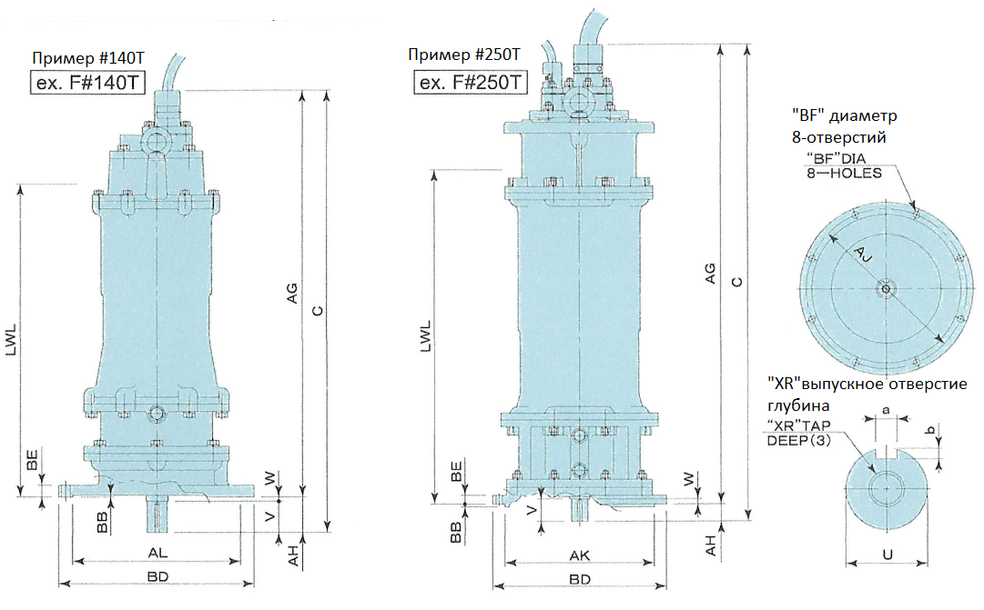 (1)BD варьируется ± 0.1. (2) U варьируется от +0.0000 до -0.001. (3) XR Глбина выпускного отверстия: 140Т1 – 0.88, 140Т3-250Т1 – 1.38, 320Т1 – 1.5 и 360Т1 – 2.0. (4) AL (для 140Т1-180Т1) варьируется от +0.004 до -0.000 / АК (для 180Т3-360Т1) варьируется от +0.000 до -0.002. (5) Минимальная глубина погружения