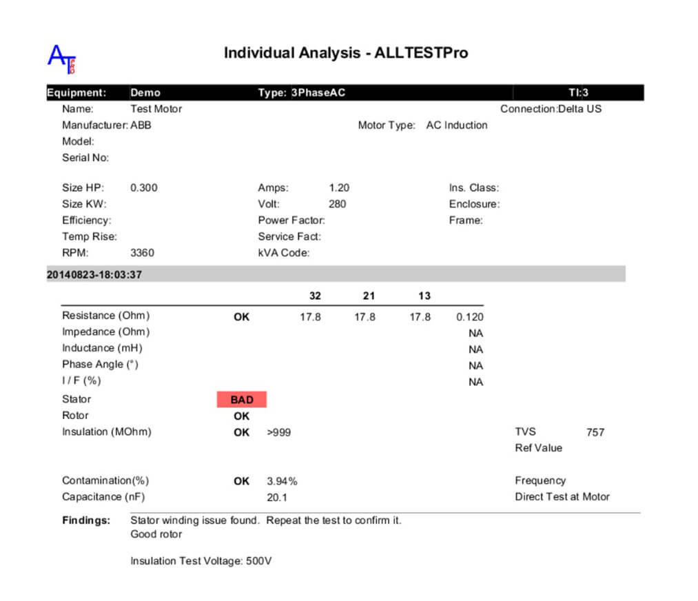 TVS ™ фиксирует все изменения состояния изоляции обмотки или ротора. Технологическим преимуществом использования метода TVS ™ является устранение ошибок, которые возникают из-за дисбаланса индуктивности. Дисбаланс в данном случае зависит от положения короткозамкнутого ротора, а TVS ™ не зависит. ATP снабжены единственными в мире приборами для тестирования двигателей, которые измеряют значение TVS ™.