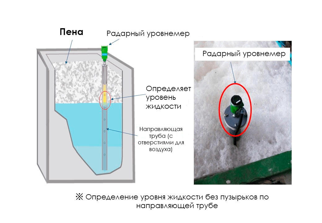 В этом случае радарный уровнемер Matsushima устанавливается на направляющую трубу и контролирует уровень внутри трубы, не содержащий пены внутри.